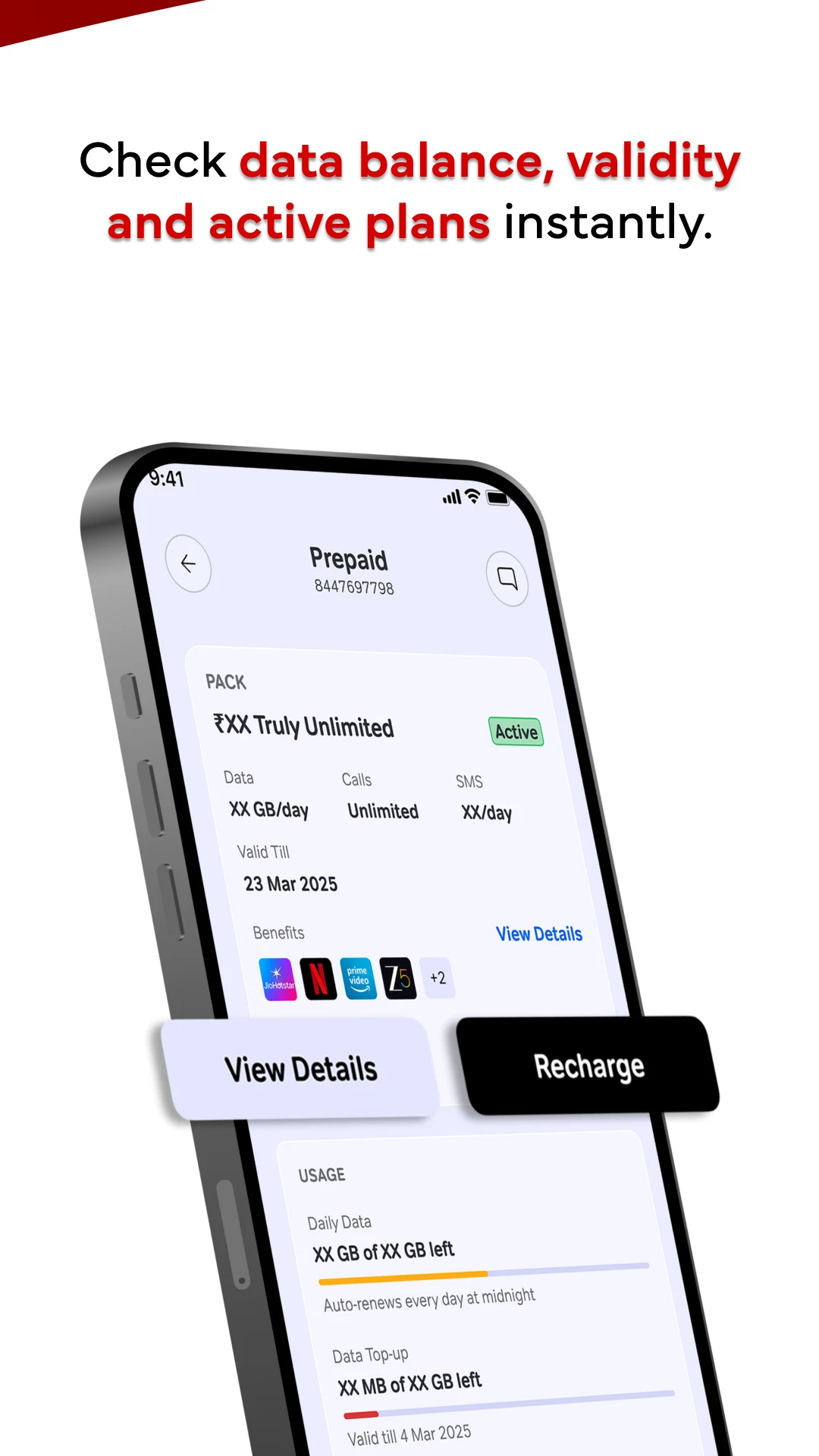 Airtel是一个全方位的数字服务平台,旨在为用户提供便捷的生活和娱乐体验。通过Airtel应用,用户可以无缝管理他们的移动通信需求,包括预付费和后付费的移动充值、DTH充值、宽带账单支付,以及FASTag充值和水电费支付,所有这些操作都可以在指尖完成,确保日常支付无忧。Airtel 5G Plus服务为用户提供了比传统网络快30倍的数据传输速度,让用户在高速网络环境中畅享互联网服务。Airtel应用也具备数据余额监控功能,帮助用户随时掌握自己的数据使用情况,避免超出套餐限制。