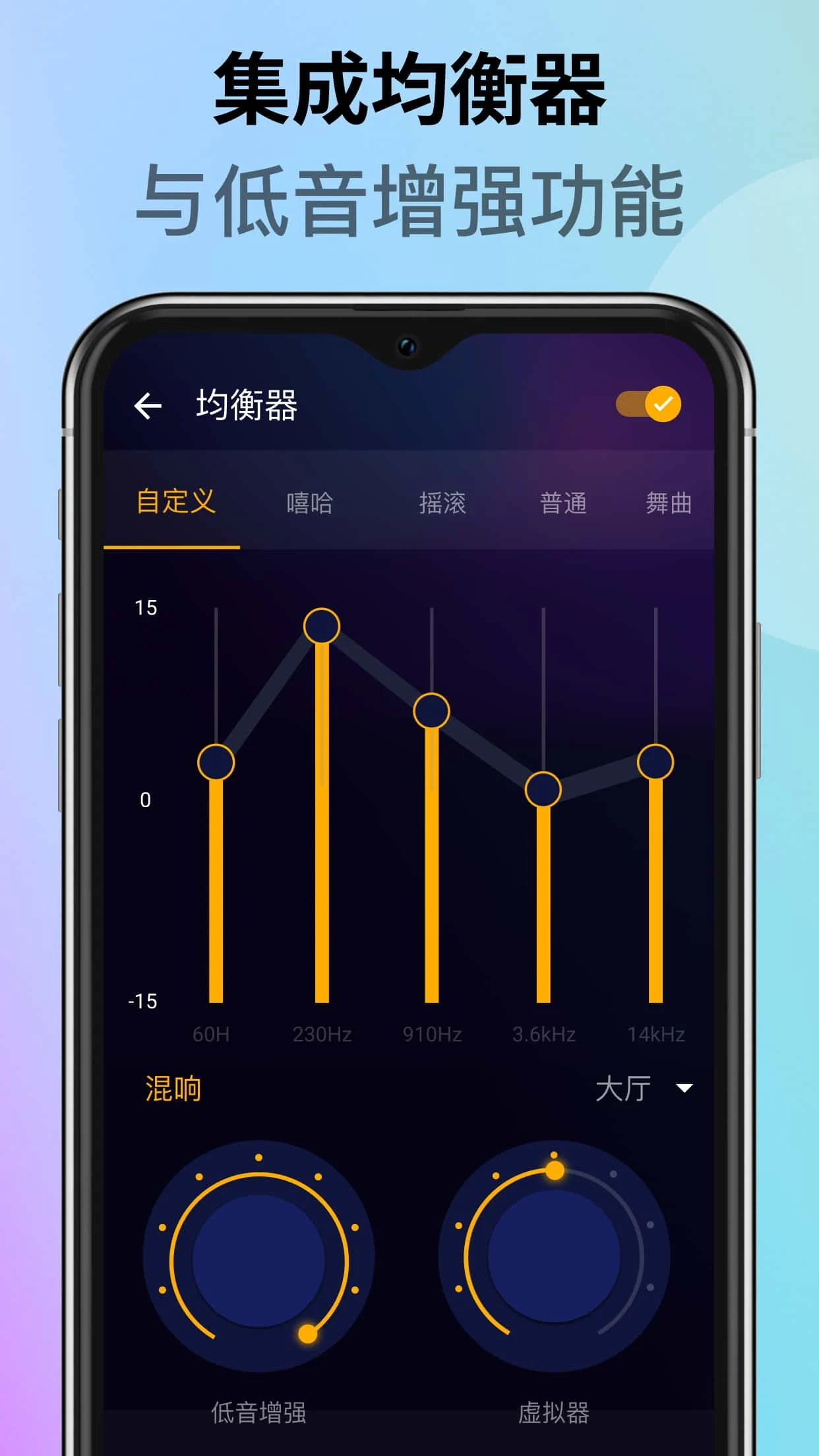 强大的声音均衡器:内置低音增强和混响效果,显著提升音乐聆听体验。