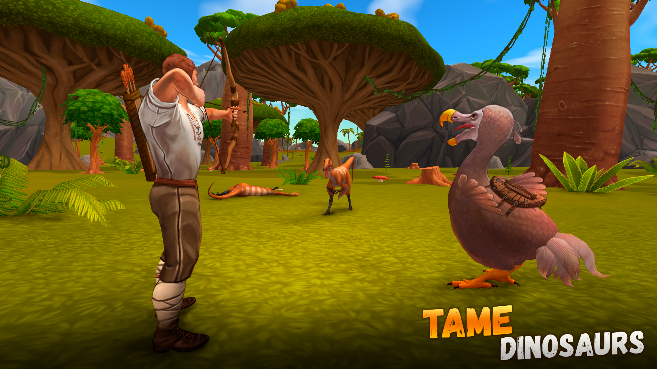 这里有大量的恐龙和野生动物。渡渡鸟是你的朋友和保护者!它会保护你免受危险的剑状龙的伤害!试着驯服野生的翼手龙!收集所有的蛋,得到大鼻角龙!驯服或狩猎!恐龙在一个被困的深层开放世界中等着你!